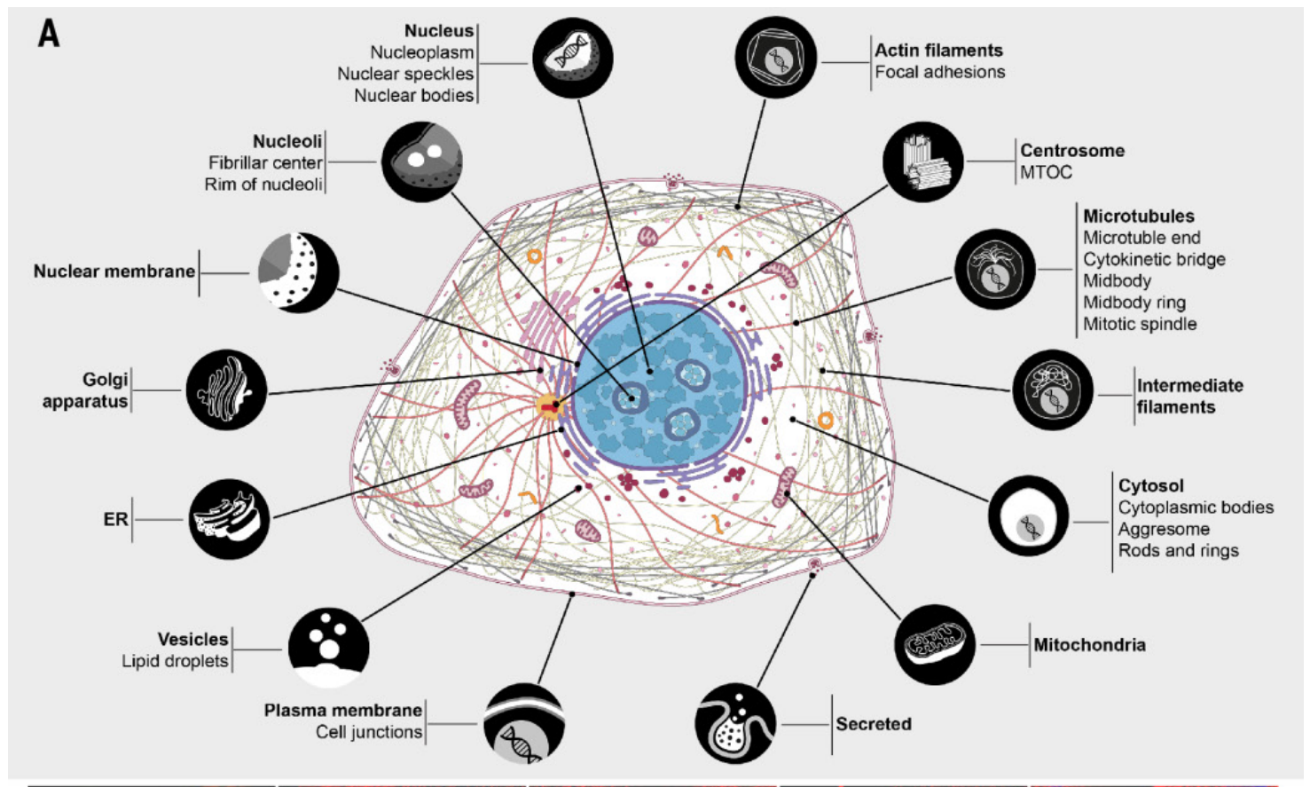 [3] Thul PJ, Åkesson L, Wiking M, et al. A subcellular map of the human proteome. Science. 2017 May 26; 356(6340): eaal3321.