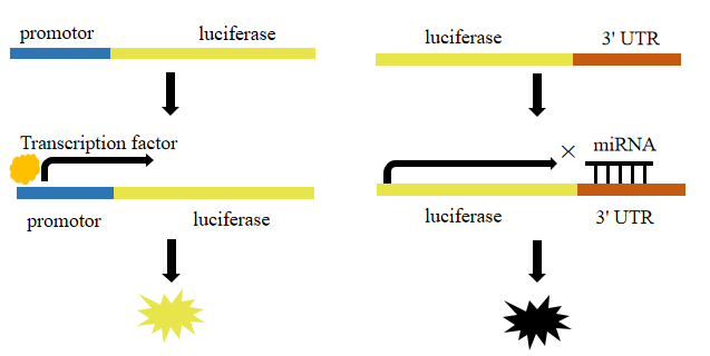 在报告基因的5'端加上待检测基因的启动子,就可以用来检测转录因子对启动子的作用,启动转录越多,那报告基因的表达量就越大,荧光值越高。如果在报告基因的3'端加上目的基因的3'UTR,就能用来检测miRNA对于目的基因的调控(抑制作用),报告基因表达越少,说明miRNA的作用就越强。