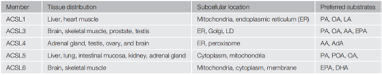 根据底物和序列相似性,ACSLs可分为两个亚族,其中ACSL1、ACSL5和ACSL6为一个亚族,ACSL3和ACSL4为另一个亚族[3]。每个ACSL家族成员都有其偏好的长链脂肪酸底物,例如棕榈酸(PA)、棕榈油酸(POA)、硬脂酸(SA)、油酸(OA)、亚油酸(LA)、花生四烯酸(AA)、肾上腺酸(AdA)、二十碳五烯酸(EPA)以及二十二碳六烯酸(DHA)等。不同的ACSLs也会催化相同的底物,它们在长链脂肪酸代谢中具有功能冗余性及相互补偿的特点。