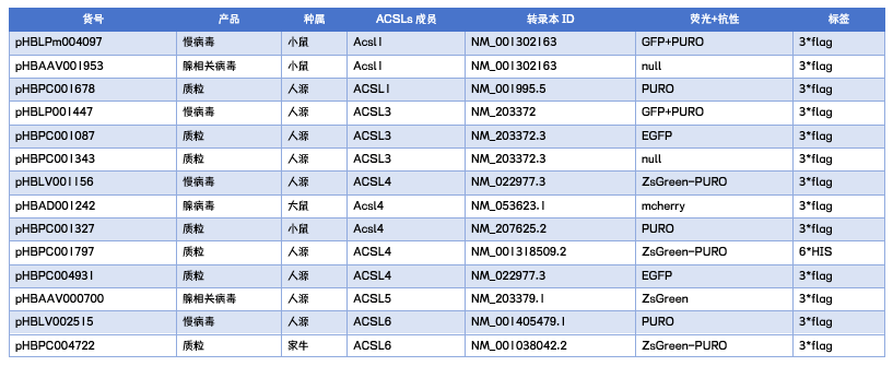总体而言,ACSLs家族成员在铁死亡调控网络中占据重要地位,深入研究其作用机制,不仅有助于深化对铁死亡这一复杂生物学过程的理解,更为相关疾病的治疗提供了极具潜力的靶点和全新策略,未来在基础研究与临床应用方面具有广阔的前景。汉恒生物专营病毒包装十余载,建立了庞大的基因研究现货工具库,现可提供ACSLs家族基因相关过表达产品,也可定制靶向特异性组织或细胞的基因调控工具,包括慢病毒(Lentivirus,LV)、腺病毒(Adenovirus,AD)、腺相关病毒(Adeno-associated-virus,AAV)以及质粒等,如有技术或产品需求,欢迎随时咨询汉恒生物微信公众号或拨打官网技术服务热线:400-092-0065。本期内容到这里就结束了,下期我们将会继续分享表观遗传修饰相关的内容,敬请关注!