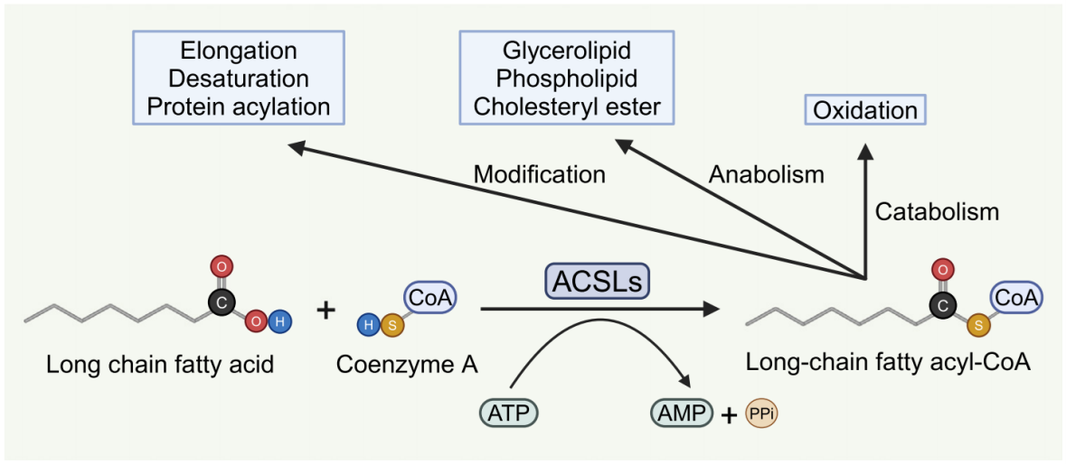 在哺乳动物中,ACSLs家族包含五个成员,分别是ACSL1、ACSL3、ACSL4、ACSL5和ACSL6。ACSL1于1953年被首次报道,ACSL3至ACSL6随后陆续被发现[1]。ACSLs以CoA作为辅因子,将LCFAs(链长为12-20个碳的脂肪酸)[2] 催化为LCFA-CoA,LCFA-CoA随后会参与自身修饰过程,包括链的延长、去饱和以及蛋白质修饰等过程(图1)。此外,ACSLs对于合成代谢过程(包括甘油脂、磷脂以及胆固醇酯的生物合成)和分解代谢途径(包括脂肪酸氧化)都是不可或缺的。