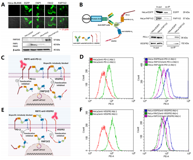 为评估FAP1V2的功能,本研究选用了人宫颈癌细胞HeLa和小鼠Lewis肺癌细胞LLC两种模型细胞系:HeLa常用于体外实验,LLC则适用于荷瘤小鼠中的免疫相关研究。将携带FAP1V2基因的质粒转染至HeLa细胞后,通过PCR等技术验证了该质粒的成功表达。Co-IP实验进一步证实,FAP1V2能够特异性结合PD-L1和VEGFR2。流式细胞术与共聚焦激光扫描显微镜(CLSM)分析结果显示,FAP1V2可显著抑制细胞表面PD-L1或VEGFR2与商品化RBITC标记对应抗体之间的结合,从而有效阻断PD-L1/PD-1信号通路。