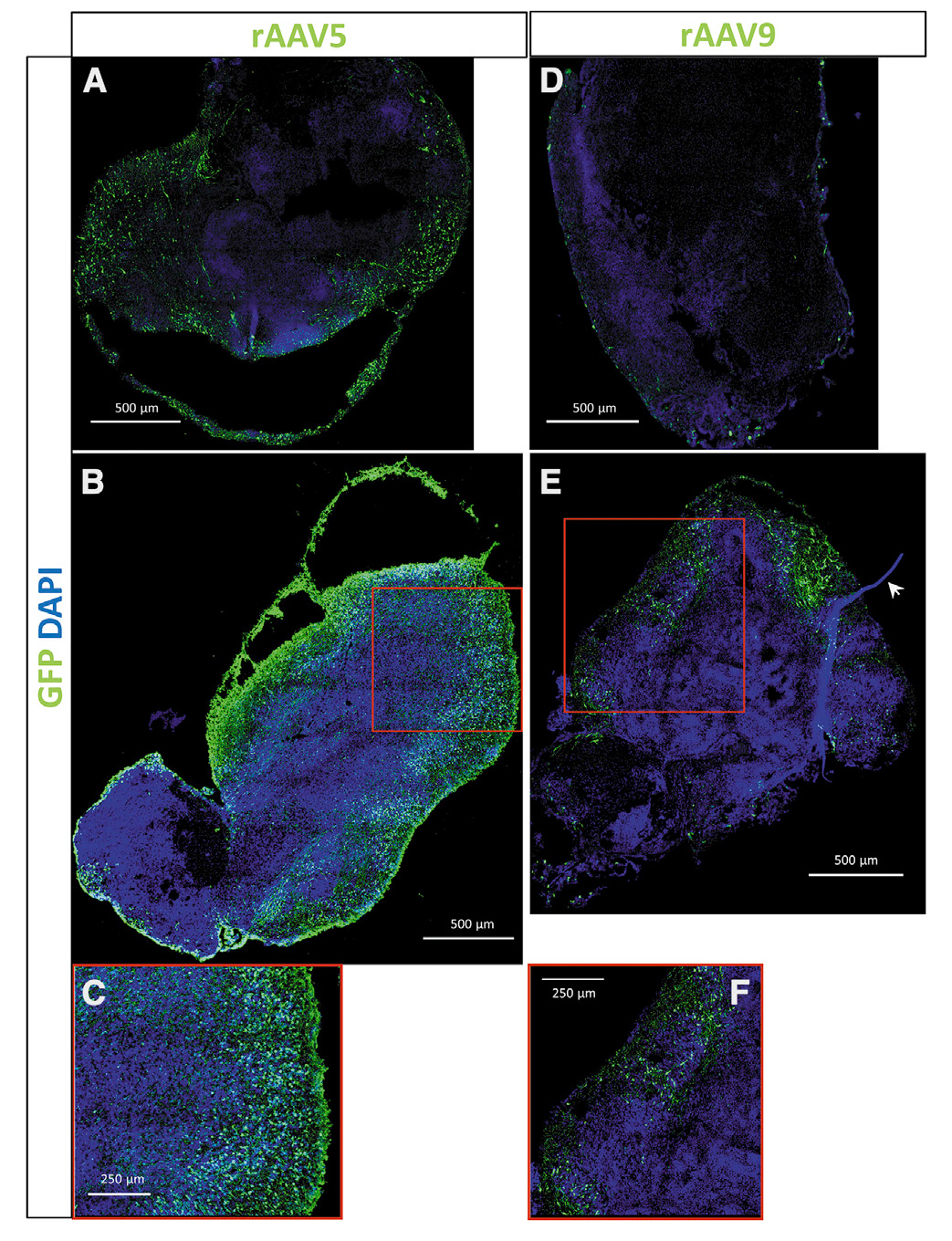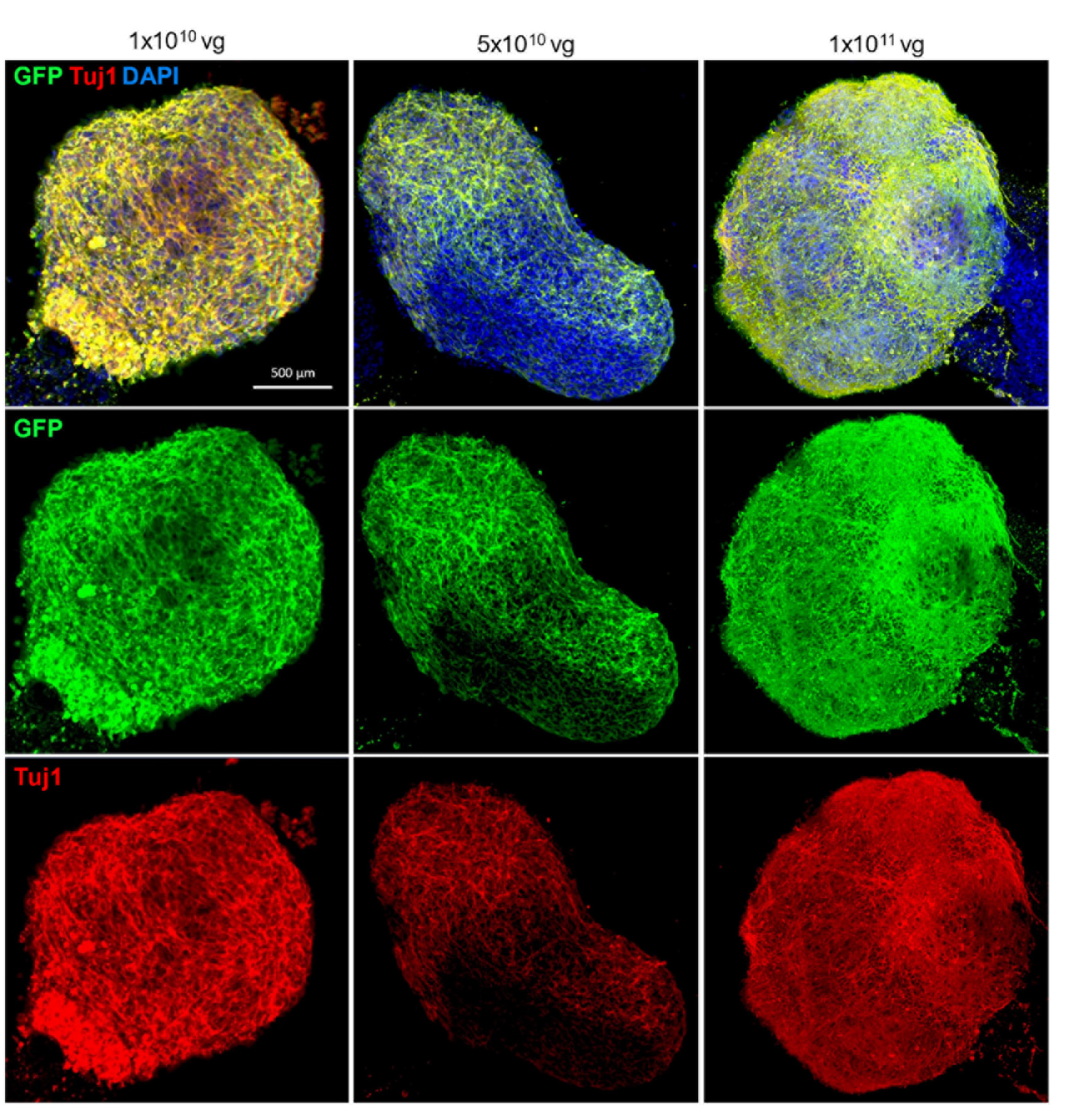 图8 不同剂量AAV(PHP.B)感染脑类器官荧光观察[21]