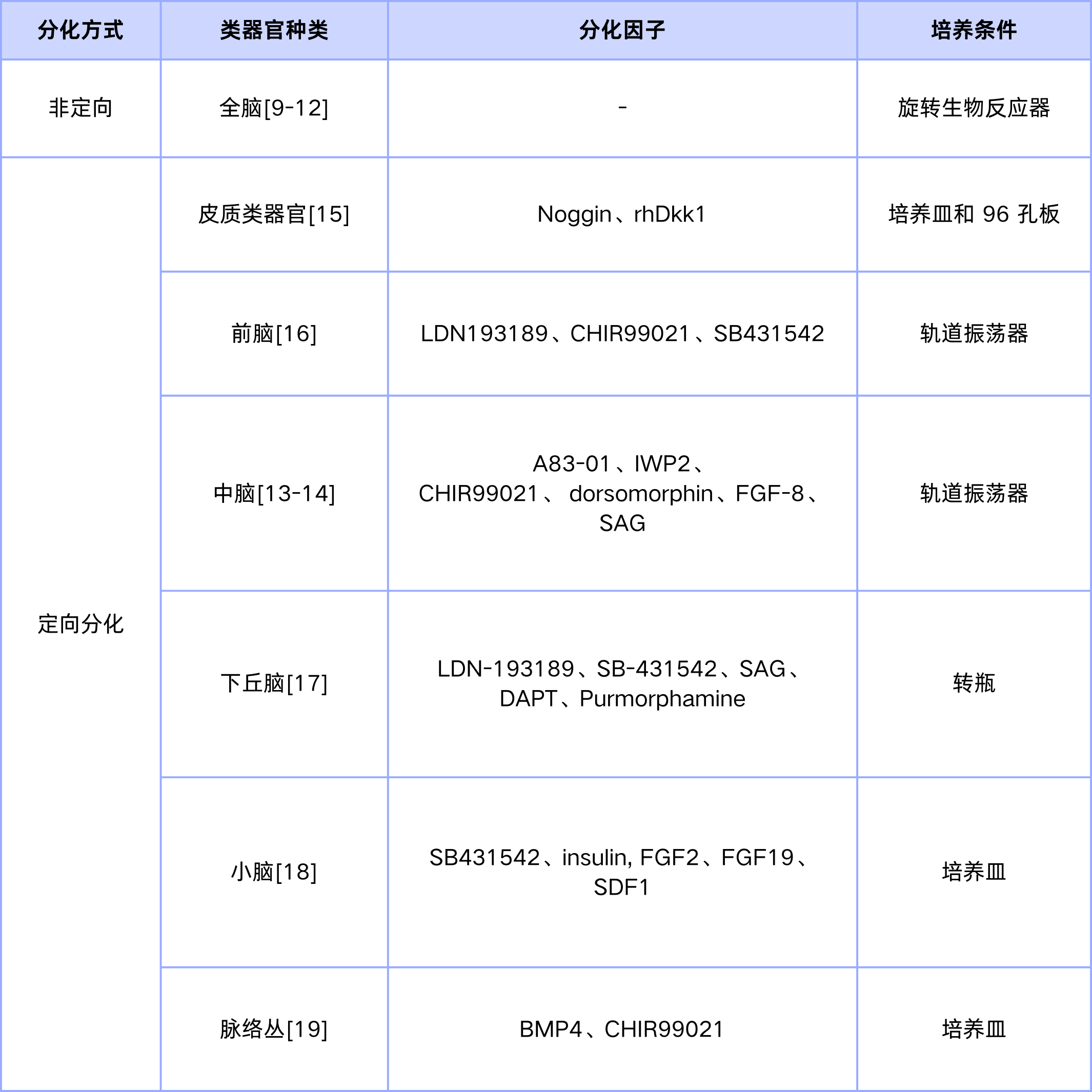 脑类器官具有与大脑相似的细胞组成和解剖结构,能够模拟大脑的发育过程,并体现其生理、病理及药理等方面的特征。在胚胎发育过程中,神经管逐渐形成三个初级囊泡,这些囊泡最终发育为整个大脑。从头至尾依次分化为前脑、中脑与后脑,其中前脑进一步发育为端脑、间脑和视神经泡。在脑类器官的培养过程中,这些大脑区域能够自发形成,无需依赖外源性模式因子引导神经分化。根据分化策略的不同,目前的脑类器官系统主要分为两类:非定向分化(无引导)脑类器官和定向分化(引导)脑类器官[8]。