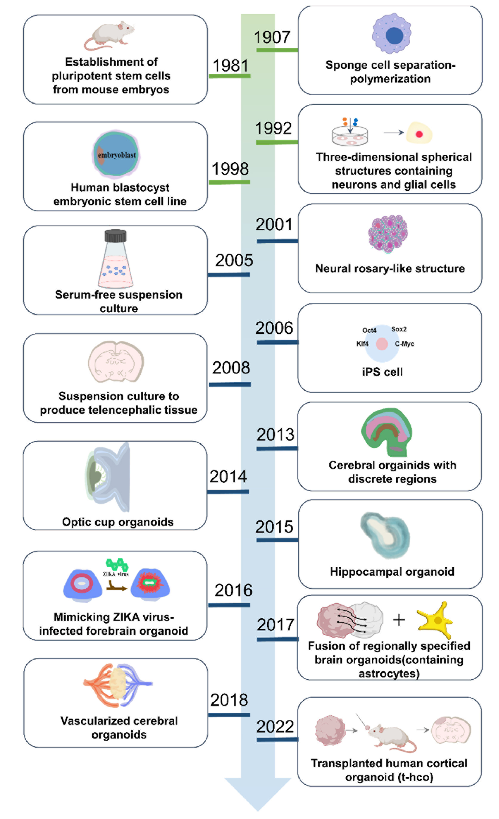 1907年,Wilson[1]首次观察到海绵细胞的自组织能力,这为后续类器官研究奠定了早期基础。随着干细胞技术的兴起与发展,脑类器官研究领域迎来了两个里程碑式的突破:Martin[2]等人成功从小鼠胚胎中分离出多能干细胞,以及Takahashi与Yamanaka[3]发现重编程因子,实现了体细胞向多能干细胞的诱导转化。随后,Zhang[4]等学者证实胚胎干细胞能够形成神经玫瑰花结结构,这一结构是生成脑类器官的关键中间阶段。2005年,Yoshiki Sasai[5]团队首创无血清悬浮培养法(Serum-free culture of embryoid body-like quick-aggregation, SFEBq),通过添加神经分化诱导因子,成功将小鼠胚胎干细胞分化为端脑组织。