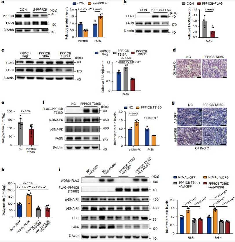 为了阐明PPP1CB在肝脏DNL中的生理功能,作者先用si-PPP1CB或PPP1CB-FLAG过表达载体转染HepG1细胞,发现FASN水平与PPP1CB呈负相关。然后,作者构建了PPP1CB的突变型过表达载体,其中Thr316被丙氨酸(PPP1CB-Thr316Ala)或天冬氨酸 (PPP1CB-Thr316Asp)取代,以分别模拟蛋白质的去磷酸化和磷酸化,发现PPP1CB去磷酸化后 FASN 水平升高,相反,PPP1CB磷酸化后 FASN 水平降低,随后,作者在小鼠肝脏中过表达PPP1CB-Thr316Asp并结合WB实验检测,结果表明,WDR6通过降低PPP1CB(Thr316)磷酸化水平,并在上游刺激因子1(USF1)的介导下促进Fasn基因的转录和脂肪酸的合成。