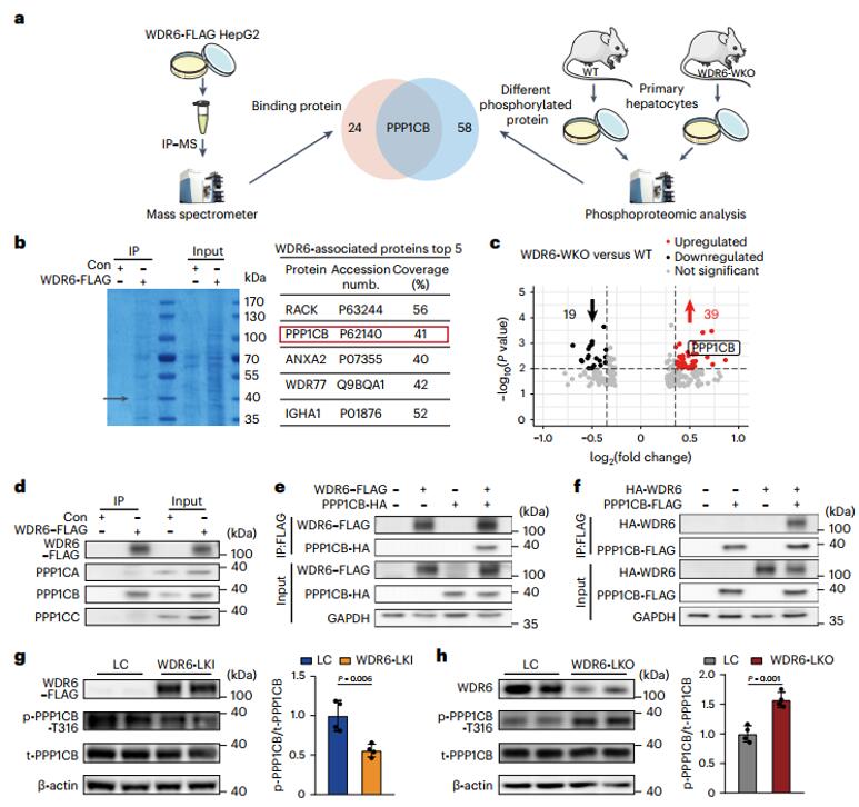 接下来,作者继续探索了WDR6调控Fasn表达的机制。作者对WDR6全身敲除的小鼠(WDR6-WKO)和WT小鼠的原代肝细胞进行转录组学分析,结果提示WDR6可能参与FASN翻译后调控过程。然后作者用免疫沉淀(IP)结合质谱确定了WDR6与PPP1CB结合,随后对WDR6-WKO和WT小鼠的原代肝细胞进行磷酸化蛋白组学分析发现,PPP1CB的第316位苏氨酸(Thr316)的磷酸化在WDR6-WKO的肝细胞中增加。接着,作者研究了磷酸化PPP1CB(Thr316)是否受到WDR6的影响,作者检测了WDR6肝脏特异性敲入小鼠(WDR6-LKI)和WDR6肝脏特异性敲除小鼠(WDR6-LKO)中PPP1CB的磷酸化水平,发现WDR6-LKI小鼠中较低,而WDR6-LKO中较高,同时测试了PPP1CB的磷酸化对外源性/内源性胰岛素的反应,他们发现,与对照组相比,HFD诱导的IR小鼠的PPP1CB磷酸化水平较低,此外,与正常喂养相比,禁食16小时后PPP1CB磷酸化水平升高并在重新喂养6h后急剧下降,上述处理中FASN水平与PPP1CB磷酸化水平显示出相反的变化。这些结果表明,PPP1CB(Thr316)磷酸化水平受WDR6、胰岛素和外部营养环境的影响。