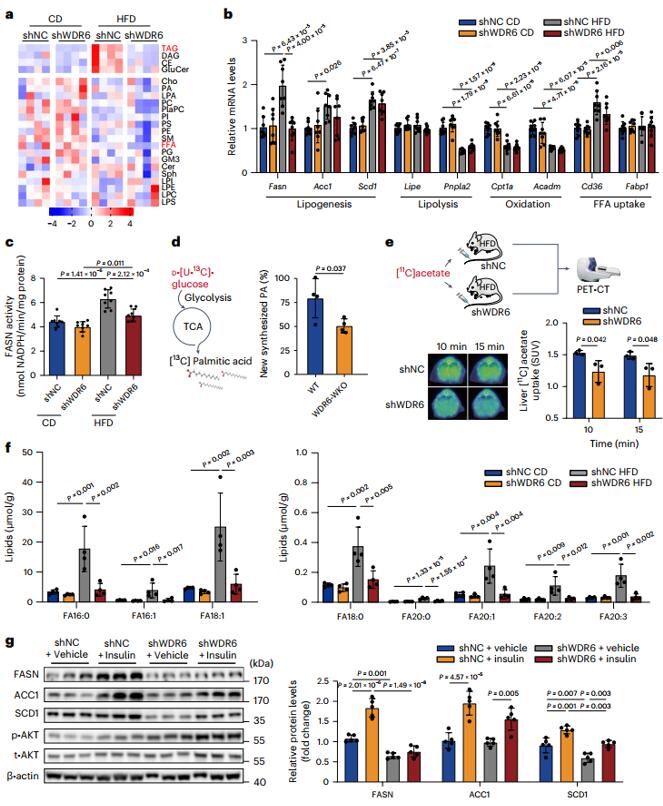 图2. 肝脏WDR6通过调节脂肪从头合成影响甘油三酯沉积