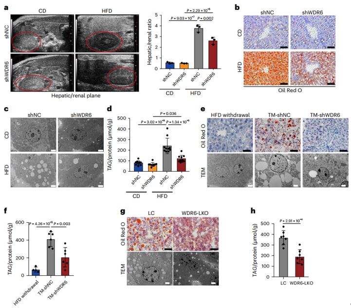 为了验证WDR6是否有助于IR诱导的肝脏代谢紊乱,作者使用了肝脏特异性的AAV病毒(AAV2/8-TBG-shWDR6)敲低小鼠肝脏WDR6的表达,注射后4周再喂食8周的HFD,通过超声分析、油红O染色、透射电镜等的分析发现,WDR6敲低小鼠的代谢紊乱以及肝脂质沉积得到改善,此外,作者用CRISPR-Cas9技术构建的WDR6敲除小鼠也得到了同样的验证结果。为了明确敲低肝脏WDR6是否可以改善HFD的不良反应,作者开发了一种治疗模型,即将AAV-shWDR6注射到已经喂食2周HFD的小鼠中,与注射对照病毒(AAV-shNC)的小鼠相比,shWDR6组HFD诱导的IR和肝脏脂质沉积减轻。综上所述,肝脏特异性抑制 WDR6可改善或逆转IR期间的代谢紊乱,尤其是肝脂沉积。