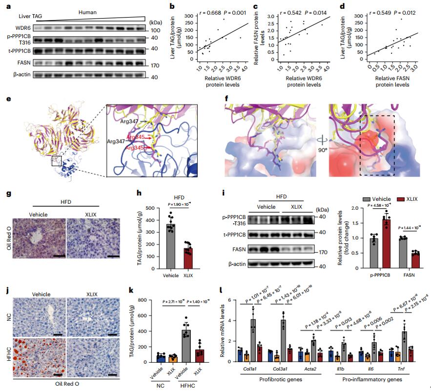 接下来,作者将研究结果扩展到了人类样本,检测了来自山东省立医院接受肝切除手术的肝胆肿瘤患者的20份肝组织样本的WDR6和FASN的蛋白质水平以及肝脏TAG含量,发现肝脏WDR6蛋白水平与肝脏TAG或FASN水平呈正相关,提示WDR6可能是肝脂肪变性的潜在治疗靶点,随后作者通过分子对接筛选出绞股蓝中的一个小分子化合物—XLIX可以与WDR6结合,并通过分子动力学模拟分析发现XLIX可以抑制WDR6与PPP1CB结合,然后作者在NAFLD模型和NASH(非酒精性脂肪性肝炎)模型中检测了XLIX的治疗效果。在NAFLD模型中,用XLIX治疗4周后(40mg/kg/天,腹腔注射),发现与对照组相比,XLIX治疗组的血脂和胰岛素敏感性有所改善,肝脂沉积和TAG水平降低,磷酸化PPP1CB增加,FASN水平降低,在NASH模型小鼠中也得到同样的验证结果,另外,NASH模型小鼠中促炎基因以及促纤维化基因的表达也有所减少。最后,作者在WDR6-LKI小鼠中进行XLIX处理,发现肝脏特异性过表达 WDR6减弱了XLIX减少肝脂积累的能力。总之,这些结果表明,XLIX通过抑制WDR6与PPP1CB结合以增加PPP1CB磷酸化的方式改善肝脂沉积并缓解疾病进展。